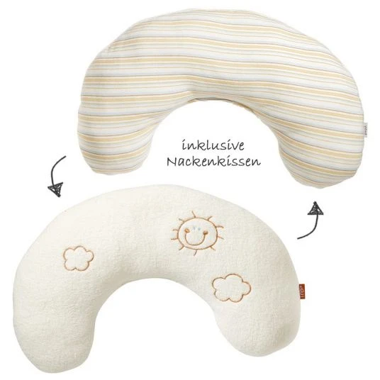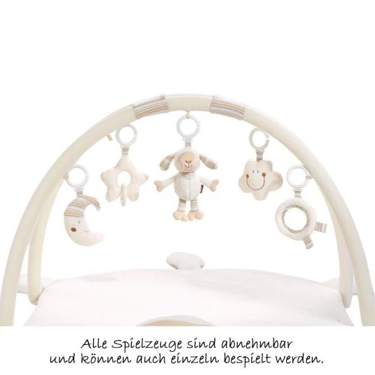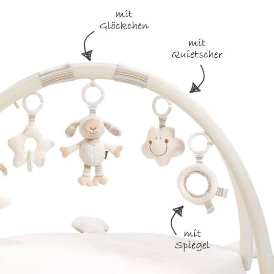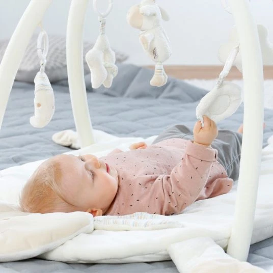 Auf und über der 3D-Activity-Decke Baby Love von Baby Fehn gibt es viel zu sehen und zu erkunden: kleine Schmusetiere, weiche Applikationen und glänzende Spiegelflächen. Da rasselt, quietscht und knistert es – Ihr Kind wird sich mit Freuden auf Entdeckungsreise begeben. Die verschiedenen Spielfunktionen trainieren die Augen-Hand-Koordination Ihres Babys und sprechen seinen Tast-, Hör- und Sehsinn an. Alle am Spielbogen befestigten Spielzeuge sind abnehmbar und können auch einzeln bespielt werden. Durch Ihren Befestungungsring eignen sich diese auch prima für unterwegs. Der Spielbogen wird mittels Klickverschluss an der Decke befestigt und kann zum waschen abgenommen werden. Ein weiches Nackenkissen sorgt für extra bequeme Spielabenteuer.