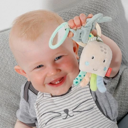 Der süße, rasselnde Oktopus lädt zum Tasten, Fühlen und Betrachten ein, während der stabile Beißring aus Holz gerne mit dem Mund erkundet wird. Für die kleinen Babyaugen ist der Spiegel besonders spannend. Der Greifling lässt sich von kleinen Kinderhänden sehr gut halten und ist mit seiner praktischen Größe von 18 cm auch unterwegs eine tolle Beschäftigung für Dein Baby. Die weichen Stoffe und das glatte Holz liegen dabei sehr angenehm in der Hand. Die niedliche Gestaltung macht das Spielzeug zu einer tollen Geschenkidee.