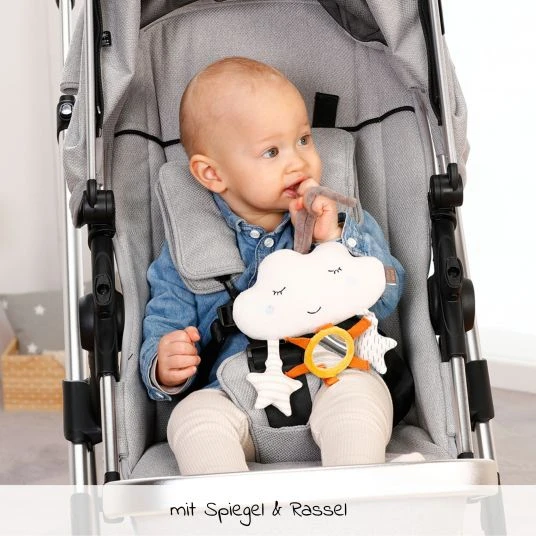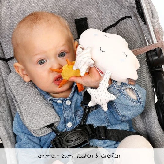 Umso mehr Babys sich weiterentwickeln, umso mehr möchten sie ihre Umgebung und Gegenstände genauer auskundschaften. Das Fehn Hängespielzeug / Mini-Mobile Wolke – Natur lädt zum Spielen und Erkunden ab der Geburt ein. Die Wolke ist tagsüber eine tolle Beschäftigung, die zum Beobachten animiert und die Aufmerksamkeit auf sich zieht. Die kleinen Anhänger ziehen garantiert die Blicke Deines Babys auf sich und mit den rasselnden Sternen kann es lustige Geräusche erzeugen.