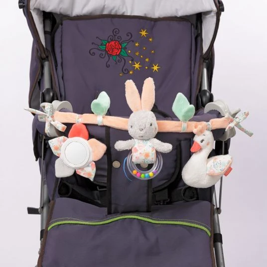 Jetzt wird gespielt! Die stylische Kinderwagenkette von Baby Fehn aus der Schwanensee Kollektion unterhält bereits die Allerkleinsten bei ihren Ausflügen. Die niedliche Schwanenprinzessin und das süße Häschen sind schon ganz aufgeregt, denn sie können es kaum erwarten mit ihrer neuen Ballerina auf Entdeckungstour zu gehen. Mit Liebe gestaltete Anhänger, die allesamt entdeckt, erforscht und erfühlt werden wollen, fördern Babys Motorik und Hand-Auge-Koordination von Anfang an. Der tolle Rasselring ist leicht zu greifen, unterstützt mit bunten Perlen in Regenbogenfarben Babys Neugier und animiert zum Schütteln und Spielen. Dabei flitzen die bunten Perlen lustig in ihrem Rohr umher. Der quietschende Schwan und die raschelnden Blätter ziehen mit Geräuschen die Aufmerksamkeit auf sich. Der kleine Spiegel fördert spielerisch Babys Selbsterkennung und ein Softbeißer mit Noppenstruktur unterstützt beim Zahnen. Zwei stabile Klemmen ermöglichen die schnelle, einfache und flexible Befestigung der Kinderwagenkette an Babyschale, Kinderwagen und Bettchen und bieten dabei optimalen Halt. So hilft die Kinderwagenkette kleinen Entdeckern auch unterwegs spielerisch die Welt zu entdecken.