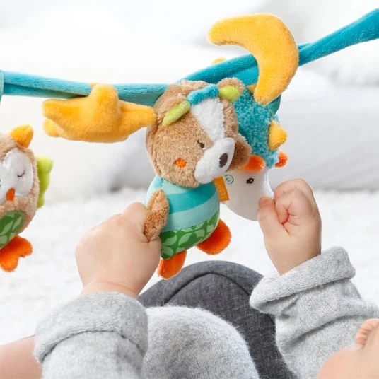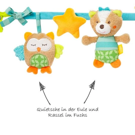 Die bunte Kinderwagen-Kette Sleeping Forest von Baby Fehn ist unterwegs immer mit dabei. Dank der praktischen Klemmen ist sie im Handumdrehen am Buggy befestigt und immer in Babys Griffweite. Die weichen Spieltiere an der Kette laden zum Tasten, Fühlen und Erkunden ein. Die kleine Eule hat eine lustige Quietsche im Bauch und der Fuchs eine witzige Rassel. Beide Geräusche wecken die Neugierde Ihres Kindes und fördern seinen Hörsinn. Der kleine Igel regt dagegen den Sehsinn an. Er hat einen Spiegel auf dem Bauch, in welchem Ihr Baby einen ersten Blick auf sich selbst erhascht.