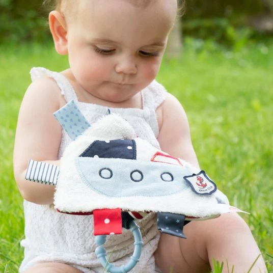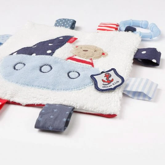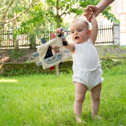 Lustiger Spielspaß ob Zuhause oder unterwegs: Mit dem praktischen Ring kann das Knistertuch Teddy aus der Ocean Club Kollektion von Baby Fehn an Kinderwagen, Babyschale oder Bett befestigt werden. Die verschiedenen Spielmöglichkeiten sorgen überall für gute Laune – Raschelpapier, Quietsche und die vielen Greifelemente regen die Neugier an und fördern Babys Greif- und Tastsinn sowie die Feinmotorik. Das geschmeidige Material aus Softvelours, Stoff, Plüsch sowie das niedliche Teddy Design sorgen für kuscheliges Spielen & Erkunden, damit wird das Knistertuch sicher zum treuen Begleiter ob Zuhause oder auf Reisen.