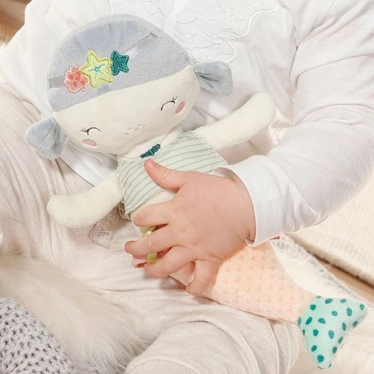 Flauschig weich, mit Applikationen bunten Details ausgestattet, bietet das hübsche Meermädchen verschiedene Möglichkeiten zum Tasten und Fühlen. In praktischer Form und mit vielen Greifmöglichkeiten versehen, lässt sich die niedliche Begleiterin überall mit hinnehmen und gut von kleinen Kinderhändchen halten. Wird die Spielgefährtin einmal schmutzig, kannst Du sie einfach in der Maschine reinigen.