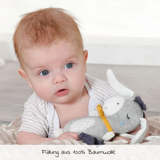 Dank der praktischen, handlichen Größe kann der kleine Esel überall dorthin mitgenommen werden, wo er gerade benötigt wird: Am Bettchen, zur Ablenkung am Wickelplatz oder im Kinderwagen für unterwegs. So hat Dein Kleines seinen vertrauten Einschlafhelfer und tröster in jeder Lebenslage bei sich. Möchtest Du den Esel waschen oder soll er nur noch als Kuschelfreund dienen, kannst Du das Spielwerk zum Aufziehen einfach herausnehmen.