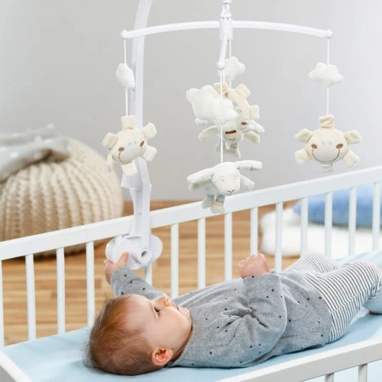 Dieses süße Musik-Mobile Baby Love von Baby Fehn ist der ideale Schlafbegleiter für die Kleinen. Die Spieluhr dreht sich langsam im Kreis und die süßen Schafe tanzen zu der Einschlafmusik. Die Melodie Schlaf Kindlein Schlaf beruhigt Dein Baby und wiegt es sanft in den Schlaf. Das hochwertige und weiche Material ist angenehm zu fühlen und zu greifen, die verschiedenen Farben wecken die Aufmerksamkeiten Deines Kindes.