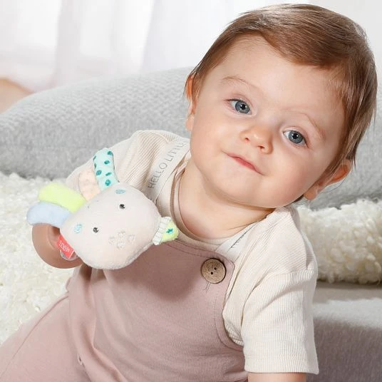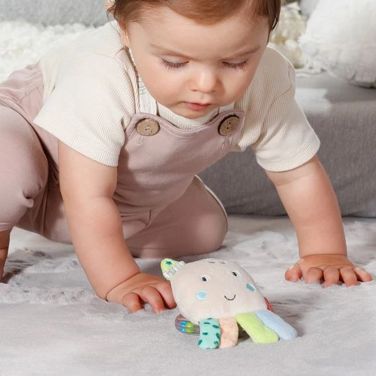 Der süße Oktopus lädt zum Greifen und Bewegen ein, während die Geräusche der Rassel und der Quietsche das Gehör des jungen Entdeckers schulen. Der Greifling lässt sich von kleinen Kinderhänden sehr gut halten und ist mit seiner praktischen Größe von 14 cm auch unterwegs eine tolle Beschäftigung für Dein Baby. Die weichen Stoffe liegen dabei sehr angenehm in der Hand, die bunten Füßchen animieren zum Tasten und Fühlen. Die niedliche Gestaltung macht das Spielzeug zu einer tollen Geschenkidee.