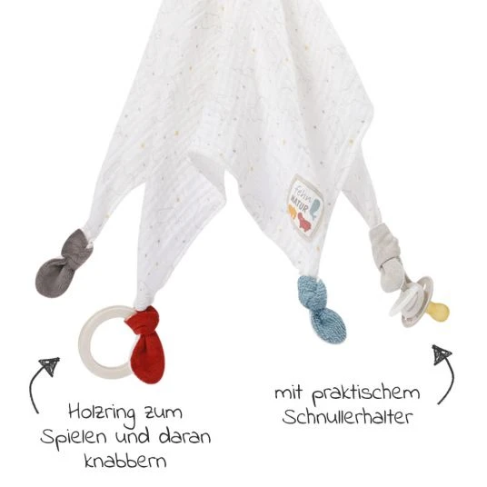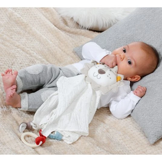 Das allerliebste Deluxe-Schmusetuch Löwe aus der fehnNATUR® Kollektion ist Tröster, Wärmespender, Einschlafhelfer und Kuschelfreund in einem und dabei Babys treuer Begleiter zuhause und auf Reisen. Beim Einschlafen spendet der niedliche Kuschel-Löwe Geborgenheit. Tagsüber laden der Holzring und die nachhaltigen Materialien aus 100% Bio-Baumwolle aus kontrolliertem und zertifiziertem Anbau sowie die Füllung aus 100% bio-basierten PLA-Fasern aus nachwachsenden Rohstoffen zum Greifen, Fühlen und Knuddeln ein, sodass der liebenswerte Löwe bald nicht mehr aus der Hand gegeben wird. Der praktische Befestigungsring am Stoff-Löwen sorgt dafür, dass Babys Schnuller auf großen Abenteuern nicht verloren geht.