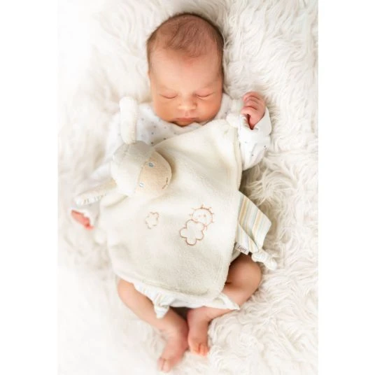 Das flauschige Schmusetuch Deluxe Baby Love – Schaf von Baby Fehn ist Kuscheltier, Schmusefreund und Trösterchen für Ihr Kind. Der weiche Stoff, mit aufgestickter Sonne und Wolken, schmiegt sich sanft an die Haut Ihres Babys. Die lustigen Knoten an den Tuchecken eignen sich prima zum Greifen und Spielen. Sie können das Schmusetuch ganz bequem bei 30° C in der Maschine waschen.