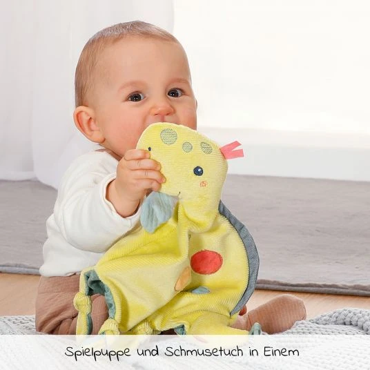 Sobald die kleinen Babyhändchen dazu in der Lage sind, greifen sie gerne nach einem Tuch zum Kuscheln. Besonders in stressigen Situationen gibt ihnen ein Schnuffeltuch mehr Sicherheit. Das Fehn Schmusetuch / Handpuppe Happy Dino ist ein flauschiger, treuer Begleiter für jede Alltagssituation, den Dein Baby immer bei sich haben kann. Der niedliche, kuschelige Dino ist mit flauschigen Details ausgestattet, die zum Fühlen und Greifen anregen. Außerdem verfügt er über eine Rassel und Quietsche, so dass er zum perfekten Geschichtenerzähler werden kann.