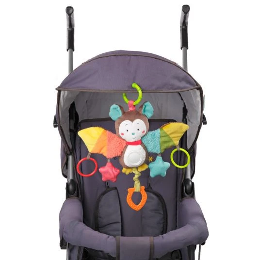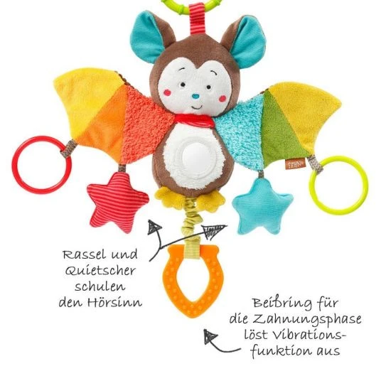 Die fantasievolle Activity-Fledermaus aus der Kollektion Jungle Heroes von Baby Fehn weckt garantiert die Neugierde Ihres Babys und lädt zum Greifen und Spielen ein. Und dabei hat es das Tierchen ganz schön in sich: zieht man an dem Beißelement vibriert die Fledermaus lustig. Der Beißring hilft Ihrem Baby während der Zahnungsphase den Spannungsschmerz zu lindern. Ein großer babysicherer Spiegel am Bauch des Tierchens trägt positiv zur Entwicklung der Ich-Wahrnehmung Ihres Babys bei. Die großen bunten Flügel punkten mit dem Materialmix und Raschelpapier, daran befestigt sind zwei Greifringe, sowie zwei Sterne. Der eine Stern mit Quietscher und der andere mit Rassel machen lustige Geräusche und fördern den Hörsinn Ihres Kindes spielerisch. Mit Hilfe des Befestigungsrings lässt sich die Fledermaus ganz einfach an der Babyschale, am Kinderwagen, Babybettchen oder auch Laufgitter anbringen.