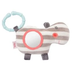 Der süße, flauschige Dino lädt mit seinen Elementen zum Hören, Tasten, Fühlen und Betrachten ein. Die Greifelemente und der Beißring mit Struktur werden gerne mit dem Mund erkundet und helfen in der Zahnungsphase die Zahnungsschmerzen zu lindern. Für die kleinen Babyaugen ist der Spiegel besonders spannend. Eine integrierte Quietsche und die Rassel mit bunten Perlen trainieren das Gehör und machen den Dino besonders spannend.