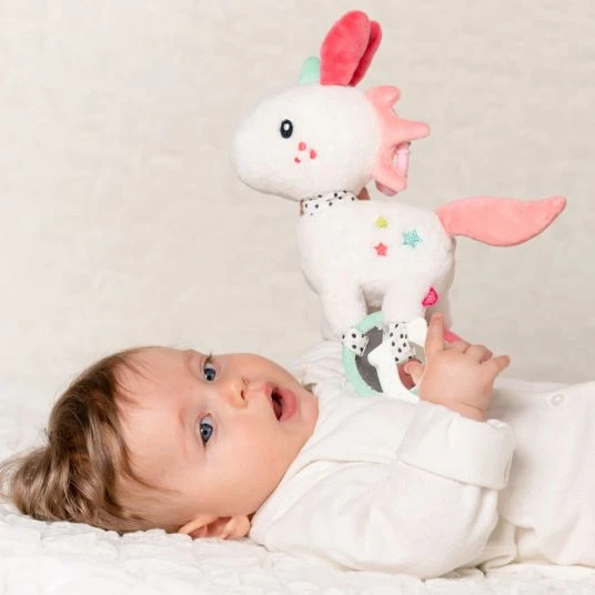 Lustiger Spielspaß für Zuhause und unterwegs: Mit dem praktischen C-Ring kann das Activity-Spieltier Einhorn Aiko von Baby Fehn an Kinderwagen, Babyschale oder Bett befestigt werden. Die verschiedenen Spielmöglichkeiten sorgen überall für gute Laune: Glöckchen, Beißring, Rassel und Quietsche regen die Neugier an und fördern Babys Greif- und Tastsinn sowie die Feinmotorik. Der kleine Spiegel trägt zur positiven Entwicklung der Ich-Wahrnehmung bei – damit wird das kleine Einhorn zum besten Freund des Babys.