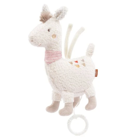 Die zauberhafte Spieluhr Lama Maya von Baby Fehn ist der ideale Schlafbegleiter für die ersten Lebensmonate Deines Kindes. Die Melodie Schlaf Kindlein Schlaf beruhigt Dein Baby und wiegt es sanft in den Schlaf. Das niedliche Lama aus der Peru Kollektion ist flauschig weich und kann ganz einfach mit Hilfe der Befestigungsbänder am Bettchen, Kinderwagen oder an der Babyschale angebracht werden. Aufgezogen wird das Tierchen an der Schnur mit Ring – so sind süße Träume garantiert. Ist Maya einmal schmutzig, lässt sich das Spielwerk über einen Sicherheits-Reißverschluss entnehmen und der Bezug kann bequem in der Maschine gewaschen werden.