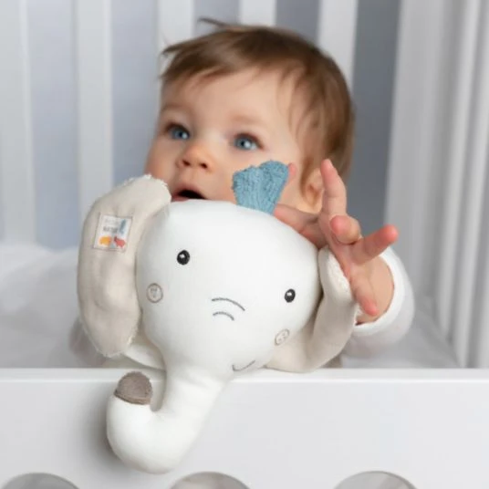 Die niedliche Spieluhr Elefant aus der fehnNATUR® Kollektion ist nicht nur ein toller erster Freund für Babys von Geburt an, sondern tröstet und beruhigt mit ihrer sanften Einschlafmelodie „Träumerei (Schumann)“. Die moderne Form des natürlichen Schlafbegleiters passt perfekt in kleine Babyhände und dank der beiden Befestigungsbänder ist der liebenswerte Stoff-Elefant zuhause und auch unterwegs schnell festgebunden an Bettchen, Babyschale oder Kinderwagen. Die nachhaltigen Materialien aus 100% Bio-Baumwolle aus kontrolliertem und zertifiziertem Anbau sowie die Füllung aus 100% bio-basierten PLA-Fasern aus nachwachsenden Rohstoffen machen das Kuscheln, Träumen und Liebhaben zu einem besonderen Vergnügen.