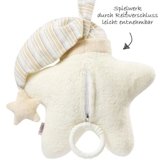 Diese süße Spieluhr Baby Love – Stern mit Mütze von Baby Fehn ist der ideale Schlafbegleiter für die ersten Lebensmonate. Die Melodie Weißt du wie viel Sternlein stehen beruhigt Dein Baby und wiegt es sanft in den Schlaf. Das hochwertige und weiche Material ist angenehm zu fühlen und zu greifen. Dank der praktischen Aufhängeschlaufe kann man die Spieluhr überall aufhängen. Das Spielwerk lässt sich durch einen Reißverschluss ganz leicht entfernen und der Stern kann dann in der Maschine gewaschen werden.