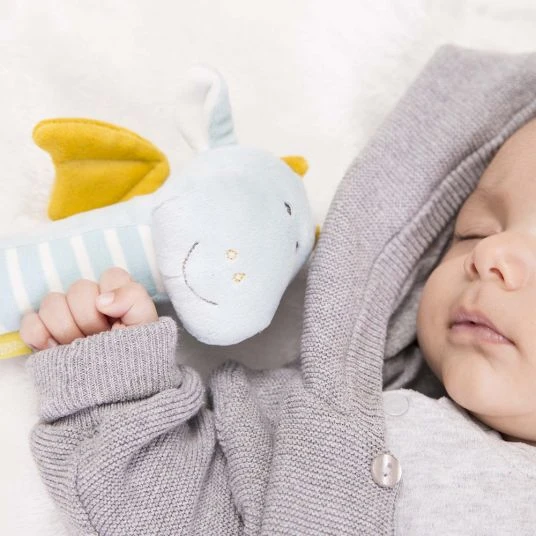 Für kleine Babyhände geschaffen, erobert der niedliche Stabgreifling Drache aus der Little Castle Kollektion von Baby Fehn im Nu Babys Herz. Der freundlich dreinschauende Drache quietscht fröhlich, wenn Dein Kleines ihn drückt. Das weckt Babys Neugier, fördert erste Greif- und Fingerübungen und bereitet ganz viel Freude, sowie lang anhaltende Unterhaltung. An den Ohren und den Flügeln des Drachen lässt es sich prima Nuckeln und Ziehen. Als toller Begleiter für zuhause und unterwegs hilft der furchtlose Drache spielerisch die Welt im wahrsten Sinne des Wortes zu begreifen.