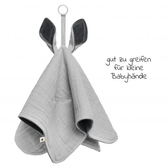 Sobald die kleinen Babyhändchen dazu in der Lage sind, greifen sie gerne etwas zum Kuscheln. Besonders in stressigen Situationen gibt ihnen ein Schmusefreund oder Kuscheltuch Sicherheit. Das Schmusetuch mit Känguru-Ohren und Schnullerbefestigung in Cloud von BIBS ist ein treuer Begleiter in jeder Lage, den Dein Nachwuchs immer bei sich haben kann. Für die kleinen Kinderhände ist der flauschige, stoffliche Beschützer sehr angenehm zu halten.