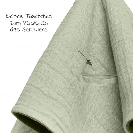 Besonders praktisch: An einem Ring lässt sich der Lieblingsschnuller Deines Babys befestigen und in einer kleinen Tasche verstauen. So geht er nicht mehr so leicht verloren. Wird das Tuch schmutzig, kannst Du es per Maschinenwäsche bei 40°C reinigen.