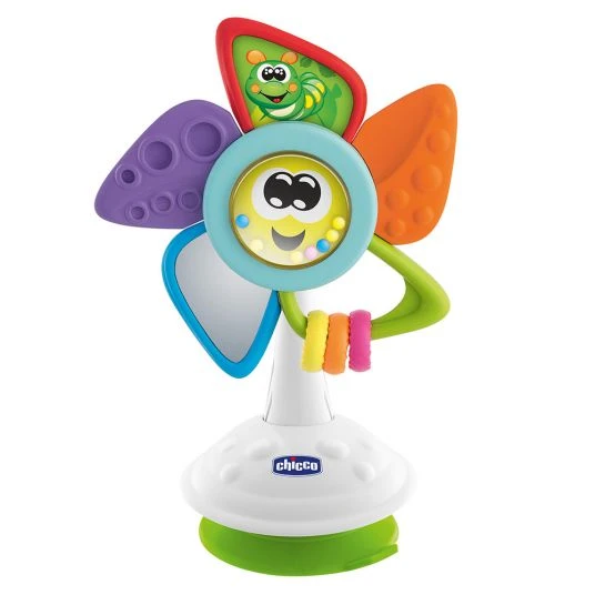 Mit dem Hochstuhlspielzeug Willy die Windmühle von Chicco wird das Warten aufs Essen zum Vergnügen. Die kleine Windmühle wird per Saugnapf einfach am Tisch oder Essbrett des Hochstuhls befestigt und sorgt für gute Laune. Dein Kleines kann ihn drehen und anstupsen, dabei rasseln die bunten Kügelchen in der Mitte. Mit den verschiedene Formen und Oberflächen von Willy, dem Spiegel, 3 klappernden Ringen und vielem mehr wird es Deinem Schatz garantiert nicht langweilig.