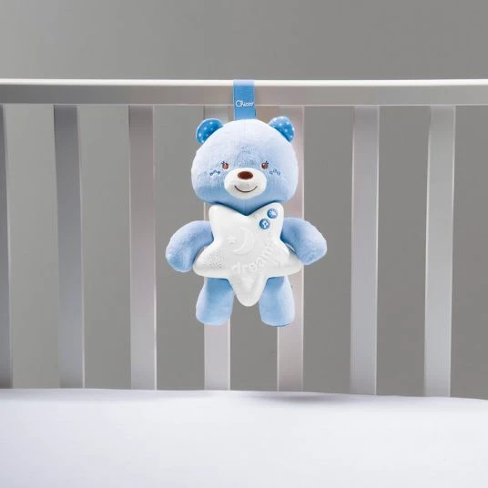 Die Spieluhr mit Nachtlicht – Gute Nacht Bärchen von Chicco hilft Deinem Baby sanft und geborgen einzuschlafen. Der große leuchtende Stern und die sanfte Melodie strahlen eine besondere Ruhe auf Dein Baby aus. Nach 10 Minuten einer Auswahl an klassischer Musik oder Naturgeräuschen (Wellen, Vogelgezwitscher, Frühlingsregen) schaltet sich der Stern automatisch ab. Die Lautstärke der Musik kannst Du in 3 Stufen anpassen. Der Teddybär lässt sich mithilfe des Klettbandes ganz leicht am Bettchen, Laufgitter, Babyschale oder Kinderwagen befestigen und kann so überall mit dabei sein.