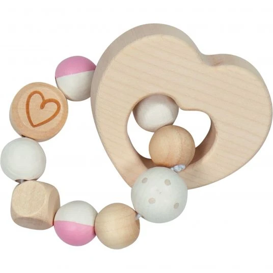 Der Elastik Greifling – Herz von Goki stimuliert die Sinne Deines Babys. Dank der zwei unterschiedlichen Formen – Perlen und Bärenkopf – wird der Tastsinn gefördert. Für die jungen Ohren ist das Klingeln des Glöckchens besonders interessant. Das Spielen, Anfassen und Drehen des Greiflings schult die Feinmotorik. Durch das Bewegen des Greiflings vor den Augen wird die Augen-Hand-Koordination Deines Kindes angeregt und erstes Greifen danach erlernt.