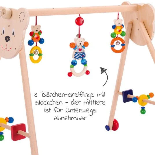 Das Spieltrapez im niedlichen Herzbären-Design ist mit drei lustigen, hängenden Greiflingen ausgestattet, die bei Berührung hin- und herschaukeln. Der mittlere Greifling lässt sich für unterwegs sogar abnehmen. Seitlich befinden sich dreh- und verschiebbare Formen, die erkundet werden wollen. Die einzelnen Spielmöglichkeiten regen den Tastsinn an und motivieren zum Greifen. Die vielen bunten Farben sind für Baby’s Augen besonders interessant.