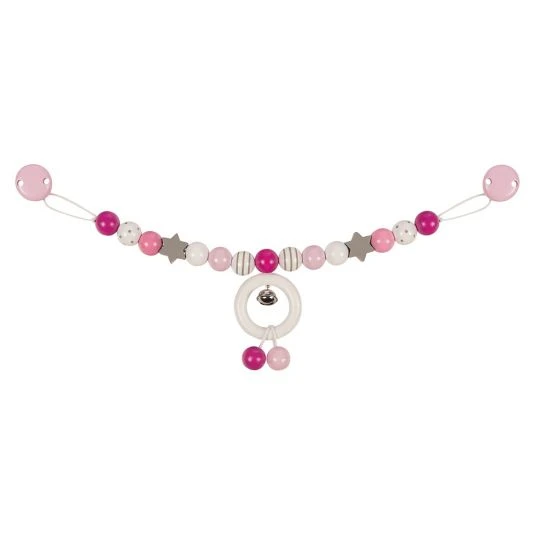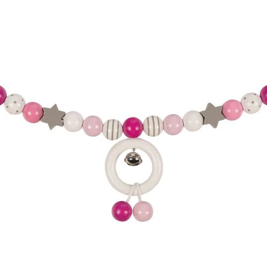Mit der Kinderwagenkette Sternchen in den Farben Rosa Grau und Weiß von Heimess wird es Deinem Baby auf Spazierfahrten garantiert nicht mehr langweilig. Die hübsche Kette lädt mit ihren unterschiedlichen Formen, Farben und Größen zum Greifen und Entdecken ein. Dabei klingelt ein kleines Glöckchen fröhlich vor sich hin und spricht den Hörsinn Deines Kindes an. Die bunten Elemente aus Massivholz weisen unterschiedliche Strukturen und Formen auf, die von Deinem Kind erfühlt und erforscht werden wollen. Der große Holzring lässt sich toll greifen und drehen. Befestigt wird die Kinderwagenkette ganz einfach mit den beiden Clips am Kinderwagen oder dem Verdeck der Babyschale.