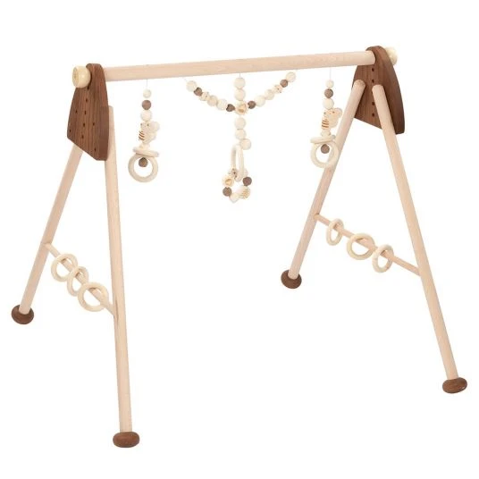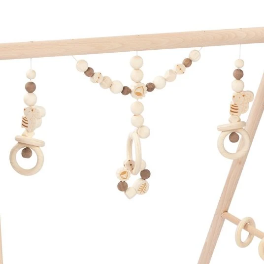 Mit dem Spiel-Trapez Baby Fit – Eichhörnchen von Heimess nature blüht Deinem Kleinen Schatz Unterhaltung der gehobenen Art, es gibt hier nämlich sehr viel zu entdecken. Seitlich hat es jeweils 3 dreh- und verschiebbare Ringe, die Dein Schatz liegend leicht mit den Händen erreichen kann. An der Stange über ihm baumeln 3 Greiflinge die bei Berührung lustig hin- und herschaukeln. Alle Spielzeuge können durch die vielen beweglichen Holzteile auch lustig klappern. So werden spielerisch die Sinne und Motorik Deines Kindes angeregt, sowie Stück für Stück trainiert. Das BabyGym lässt sich 6-fach in der Höhe verstellen und wächst mit Deinem kleinen Schatz mit. Egal ob im Liegen oder Sitzen – die Kleinen sprudeln vor Freude wenn sie verstehen wie man Bewegung und Klänge selbst erzeugt.