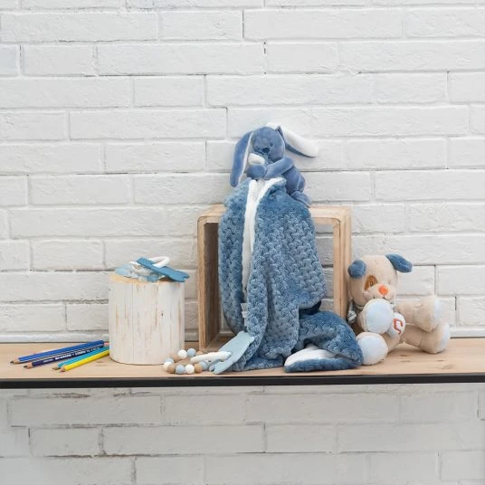 Das putzige, kleine blaue Häschen ist außerdem ein toller Zuhörer und bleibt auch nachts als Einschlafbeschleuniger oder im Kindergarten zum Kuscheln und Knuddeln da. Mit samtig weichem Polyester fühlt sich der Schmusefreund besonders weich an. Wird das Tuch mit Lapidou einmal schmutzig, kannst Du es per Maschinenwäsche bei 30°C reinigen.