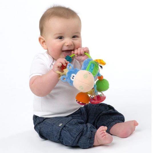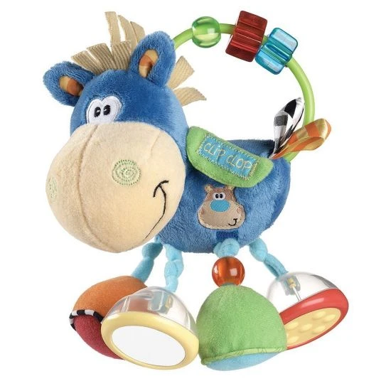 Das niedliche Rassel-Pferd Klipp Klapp in Blau von Playgro wird zum liebevollen und unterhaltsamen Begleiter Ihres Kindes. Das weiche Pferdchen ist an einem Greifring befestigt, woran es Ihr Baby gut halten kann. Unterschiedlich strukturierte Perlen lassen sich über diesen Ring führen und fördern so die Feinmotorik Ihres Kindes. Verschiedene Materialien und bunte Label-Etiketten laden Ihr Kind zum Fühlen und Entdecken ein. Seitlich auf dem Pferd befindet sich ein Klettverschluss, der sich öffnen lässt und darunter eine süße Stickerei enthüllt. An den Schlenkerbeinen befinden sich verschiedene Spielelemente, die beim Bewegen für lustige Rasselgeräusche sorgen. In den Hufen kann Ihr Kind einiges entdecken: Rasselperlen, Glöckchen, Knisterfolie und einen Spiegel. Mit diesem witzigen Pferdchen wird es sicher nicht langweilig – egal ob zu Hause oder unterwegs.
