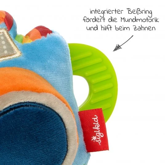 Der kunterbunte Fotoapparat lässt sich durch seine Form sehr gut von Babyhändchen festhalten und greifen. Er enthält einen Spiegel, in dem sich Dein Spatz selbst entdecken kann. Schmerzendes Zahnfleisch kann durch das Beißen auf dem Beißring beruhigt werden. Die Klänge der integrierten Rassel und der Quietsche bereiten Deinem Weltentdecker besonders viel Freude und schulen das Gehör. Für die kleinen Babyhändchen liegt der Apparat mit flauschig weichen Stoffen besonders angenehm in der Hand.