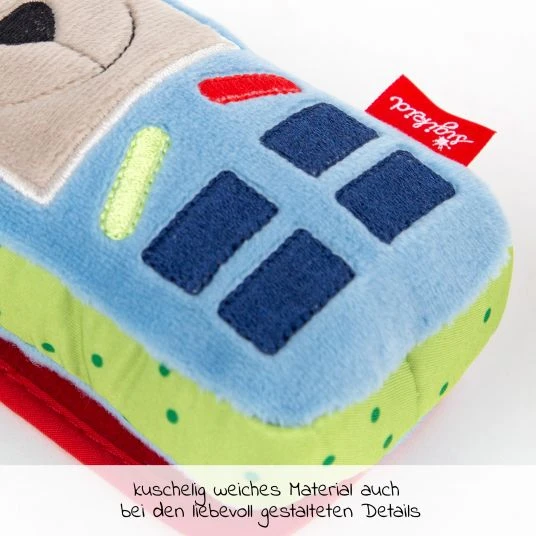 Das kunterbunte Handy lässt sich durch sein handliches Maß sehr gut von Babyhändchen festhalten und greifen. Es enthält einen abnehmbaren Klett-Spiegel, in dem sich Dein Spatz selbst entdecken kann. Die Klänge der Quietsche im Inneren bereiten Deinem Weltentdecker besonders viel Freude und schulen das Gehör. Für die kleinen Babyhändchen liegt das Handy mit flauschig weichen Stoffen besonders angenehm in der Hand.