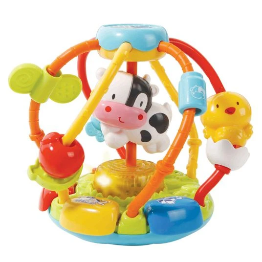 Um die niedliche Kuh herum sind Stäbe angeordnet an denen Dein Kleines verschiedene Objekte verschieben kann. Das schult schon früh seine Koordination und es lernt verschiedene Farben und Formen spielend kennen.
