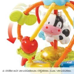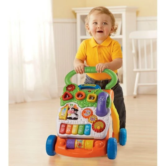 Der Spiel- und Lauflernwagen in Orange von Vtech hält jede Menge Überraschungen und Spielspaß für Ihren Nachwuchs bereit. Ihr Kind kann zum Einen das Laufen und Stehen trainieren, indem es den Wagen als praktische Stütze nutzt und zum Anderen gilt es, die lustigen Spiel-Funktionen zu entdecken. Da gibt es leuchtende Formen zum Aufstecken, bunte Musik-Tasten, drehbare Rollen und Zahnräder. Außerdem einen abnehmbaren Telefonhörer und eine witzige Kuh-Taste. Der Wagen ist mit einem Bewegungssensor ausgestattet und die Rollen sind in zwei Stufen in Ihrer Geschwindigkeit regulierbar. Er verfügt über ein gesungenes Lied, sowie eine Auswahl von elf Kinderliedern. Die entsprechenden Liedtexte finden Sie in der Bedienungsanleitung.